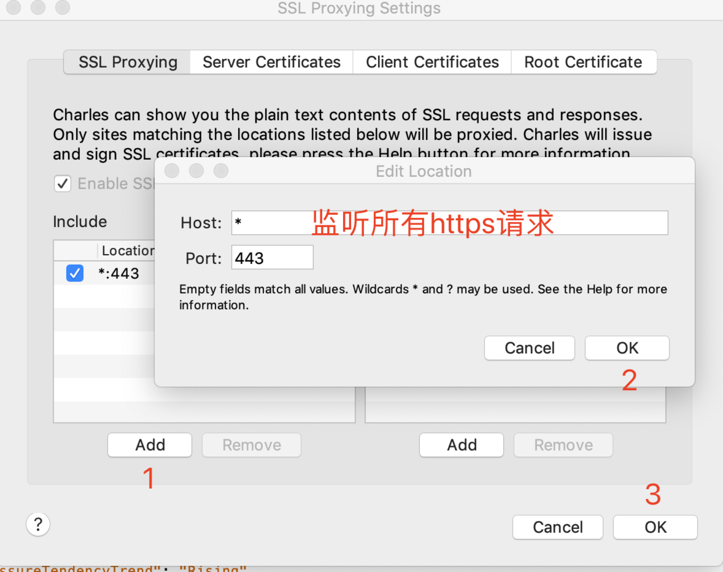 • 在Host一栏设置要解析的域名,也可以*表示所有的HTTPS都做解析,port:443;点击ok后重启charles。