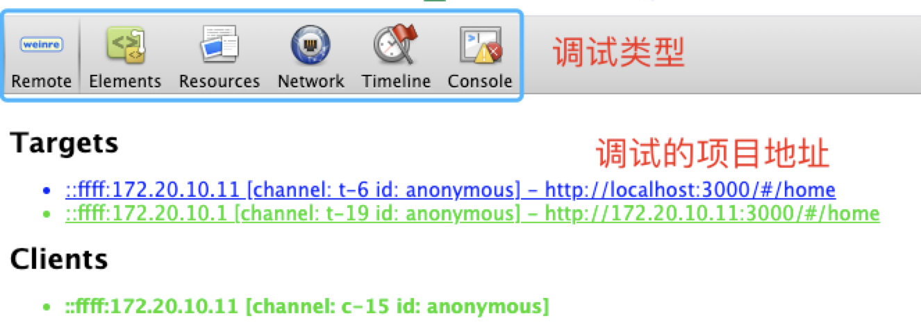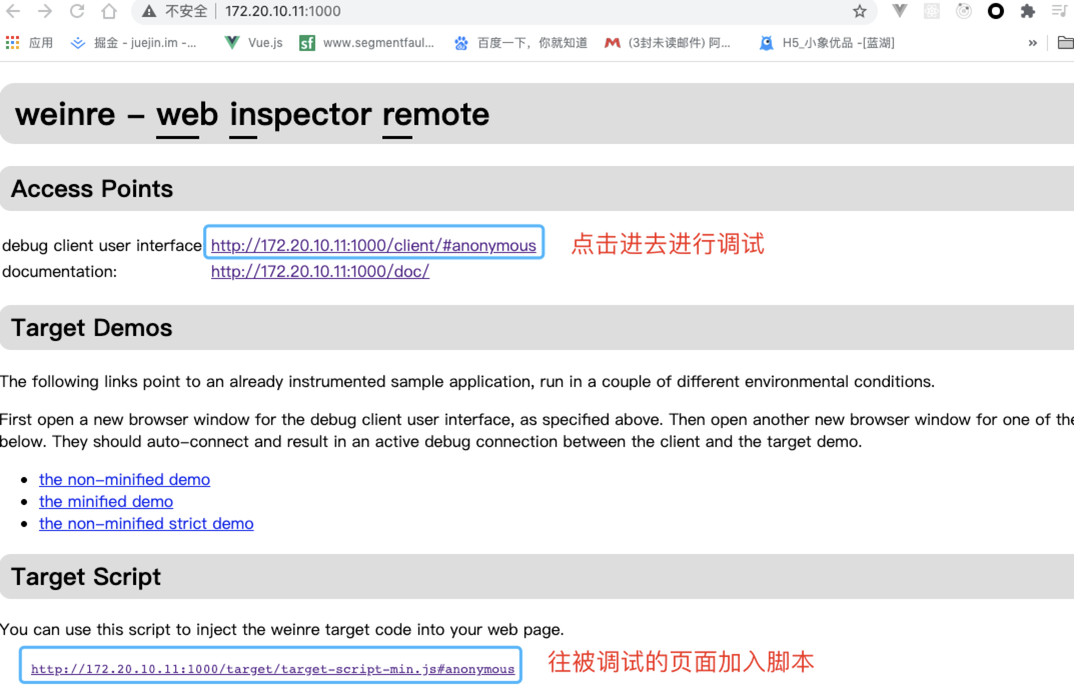 weinre --boundHost=-all- --httpPort=1000 # 启动,boundHost为all是允许本机所有有效ip访问,默认端口8080