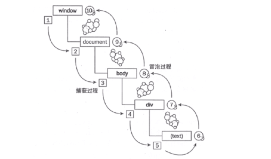 在js的事件触发经过3个阶段,事件的捕获->目标对象事件的处理->事件冒泡,假设在text中触发了事件,会经过一个捕获的阶段,父级元素将事件一直传递到本身发生的元素上,在经过本身的事件处理之后,会经历冒泡饿阶段,事件从子元素向父元素冒泡;就因为这样,事件委托成为了可能,就是将子元素的事件处理委托给父元素。